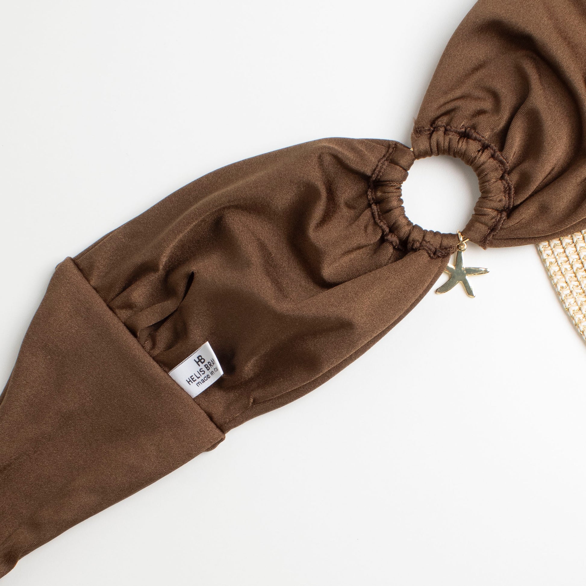 Il bikini top Helis Brain è una fascia elegante e super femminile, caratterizzata da un anello color oro al centro impreziosito da charms a forma di stella. La fascia presenta una pratica fessura interna per inserire le coppe, garantendo sostegno e modellazione personalizzata.